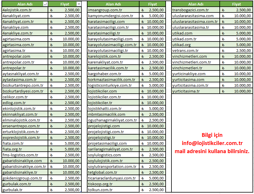 Satılık Lojistik Alan Adları Lütfen ilgilendiğiniz alan adları için irtibata geçiniz ! İrtibat : info@lojistikciler.com.tr